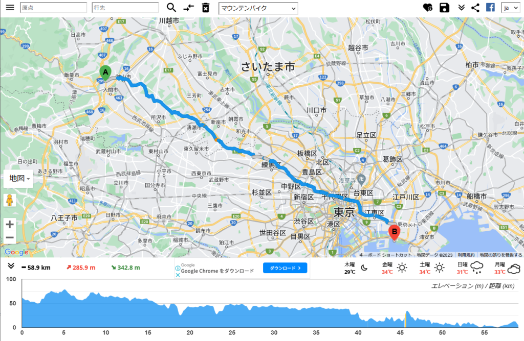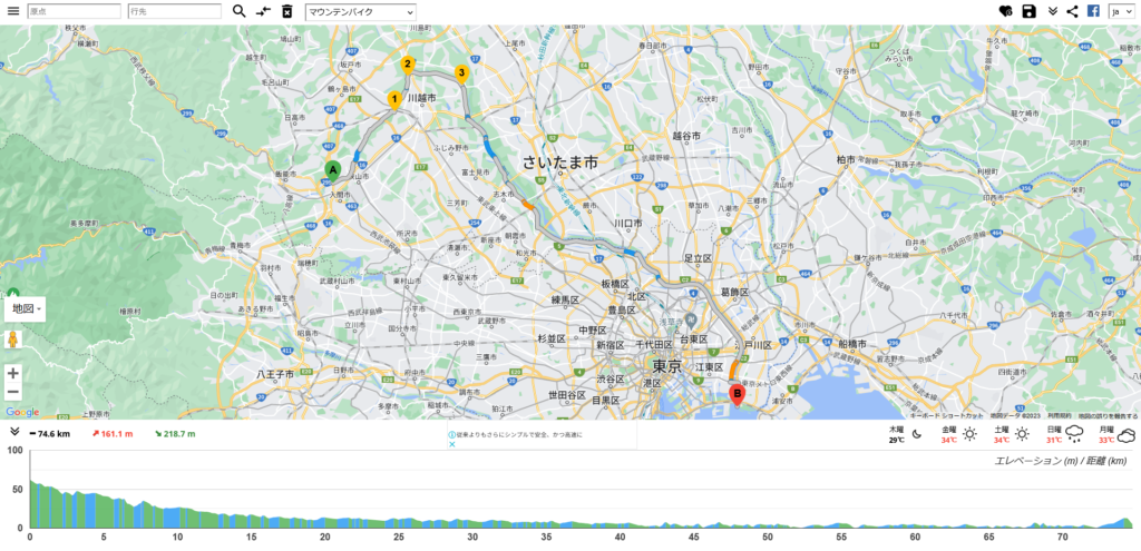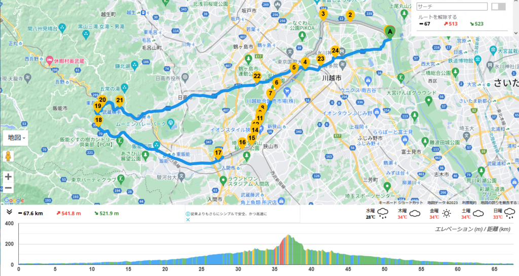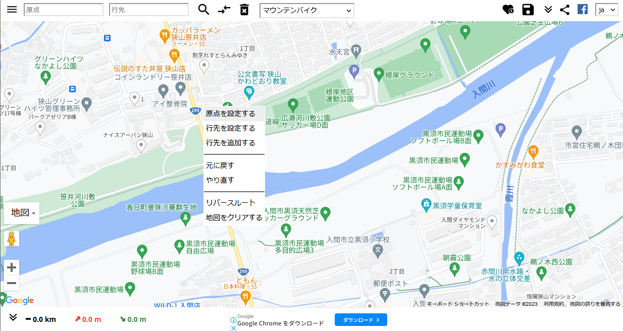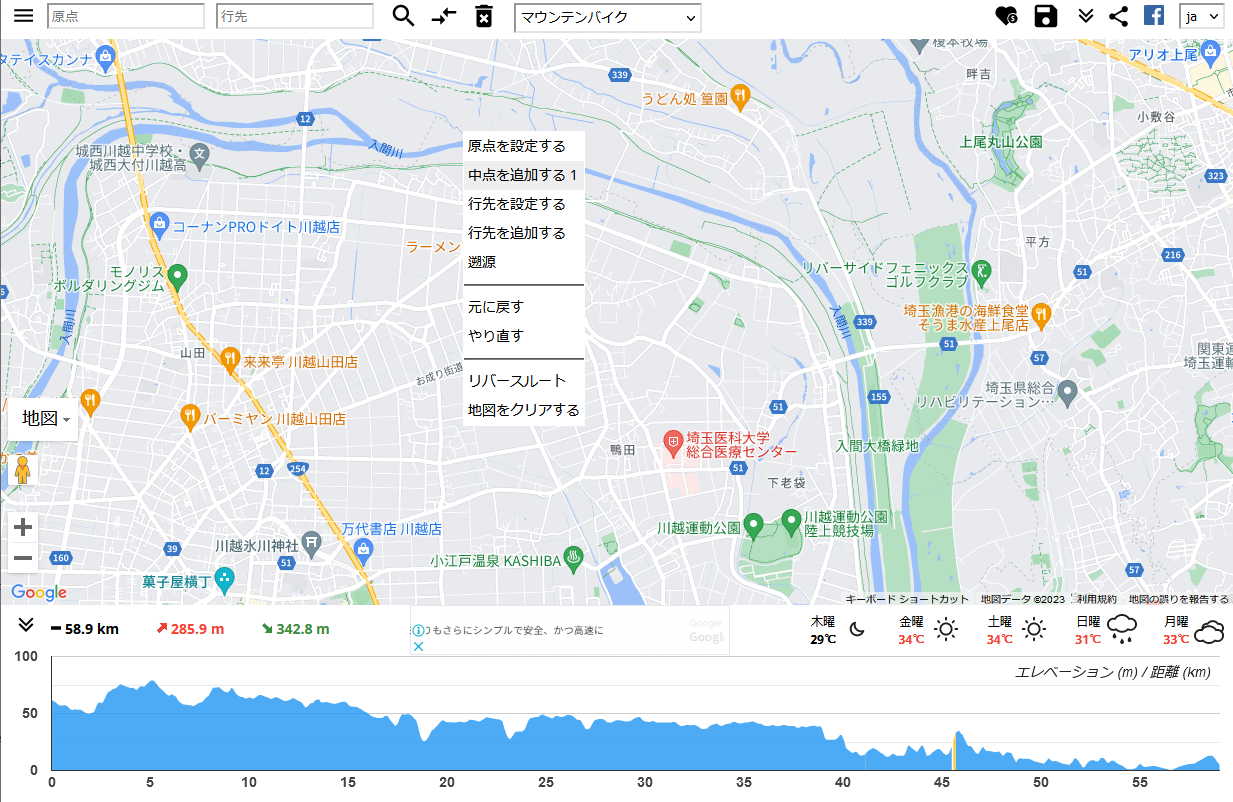 入間川と荒川のサイクリングロード経由でルートを作成したいので、経由地点を追加していきルートを調整していきます。