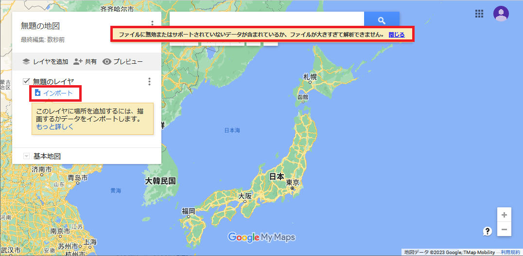 Googleのマイマップで、GPXファイルをインポートした結果、エラーとなります。