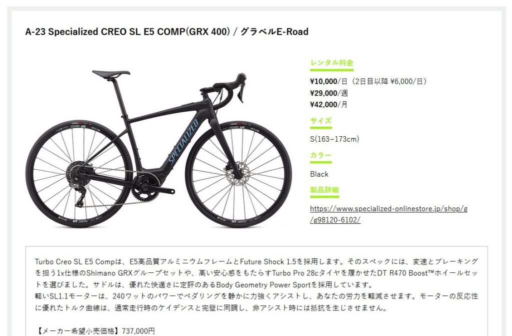中には、定価70万以上する電動グラベルロードが、たった1万円で一日レンタルできるって凄いですね。1週間でも3万円弱って・・やばいです。