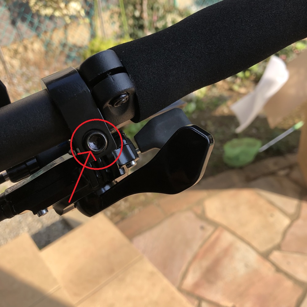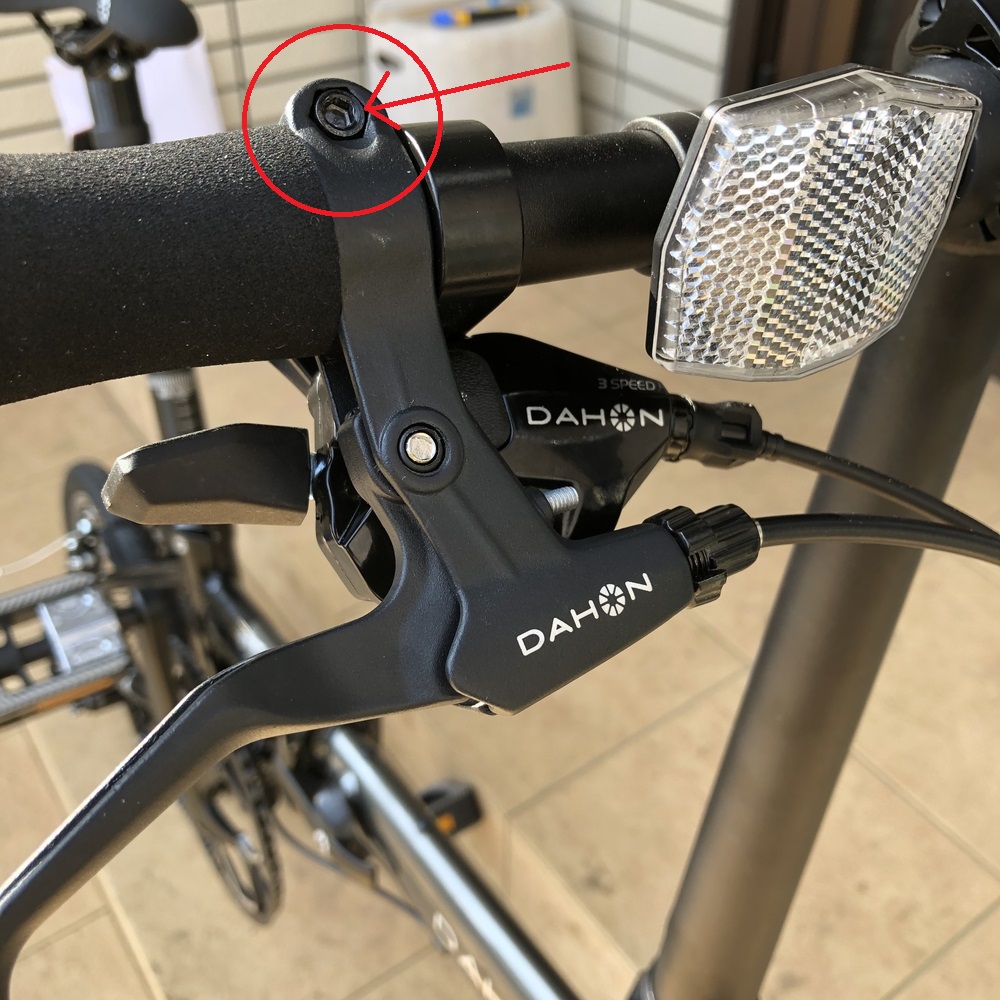 ブレーキレバーは、下記の写真で赤丸内にある六角レンチでネジを緩めます。